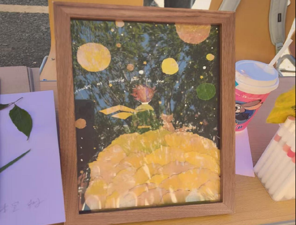 活动现场,同学们化身“环保创意家”,充分发挥奇思妙想,将校园内随处可见的落叶、闲置快递盒变为创作素材。有的将落叶拼贴成灵动的动物图案,有的把快递盒改造为精致的装饰摆件,还有作品将秋日落叶与《小王子》的浪漫元素相结合,打造出独一无二的创意作品。在亲手创作的过程中,同学们不仅体验了手工制作的乐趣,更深入理解了低碳环保、循环利用的理念,用青春行动为校园注入可持续发展的温暖力量。