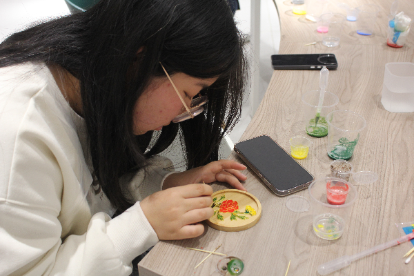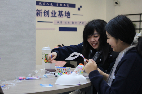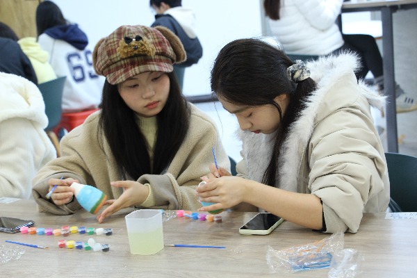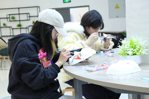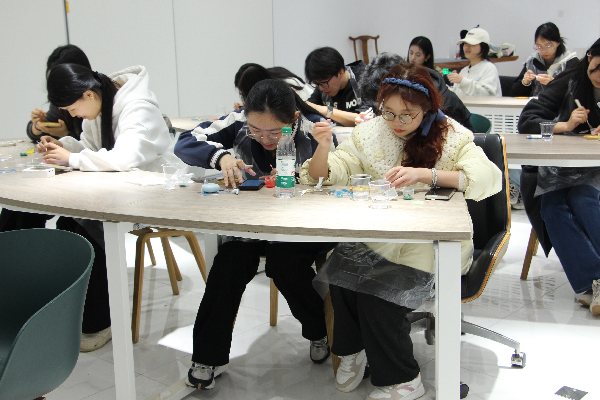 活动期间,四大手作体验区同步开放,现场创作氛围逐渐浓厚。在珐琅画区域,工作人员耐心指导同学们调配特殊沙料,大家手持细笔,用色彩细腻地勾勒出心中的图案;瓷瓶绘制区,同学们手执画笔,在素白瓷瓶上晕染山水、描摹花鸟,让传统纹样在瓶身焕发新生;脸谱创作台前,大家对照图谱细细描摹,赋予脸谱个性化的现代配色,让经典戏曲元素与当下青年潮流灵感完美碰撞;石膏娃娃手工区则充满欢声笑语,同学们为纯白娃娃精心上色,赋予其鲜活的生命力。现场氛围热烈而有序,同学们或低头专注创作,或与同伴交流心得,在动手实践中释放压力、收获乐趣。