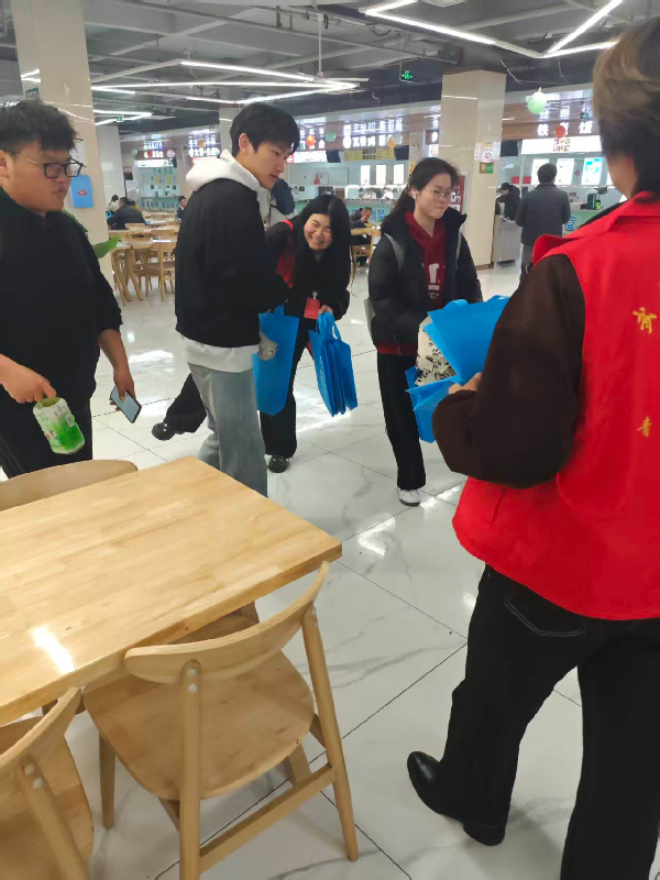 身着统一马甲的志愿者穿梭于出入口与餐桌之间,向正在用餐的师生发放蓝色手提袋。手册内容涵盖我国水资源现状、节水小妙招及相关法律法规,图文并茂、通俗易懂,引得不少同学现场翻阅。部分师生在用餐间隙交流起节水知识,食堂内洋溢着浓厚的“节水氛围”。