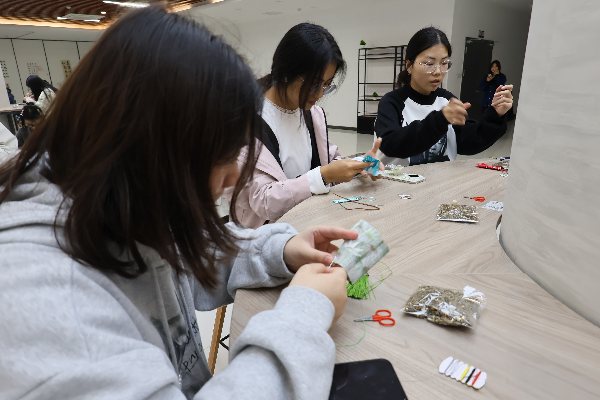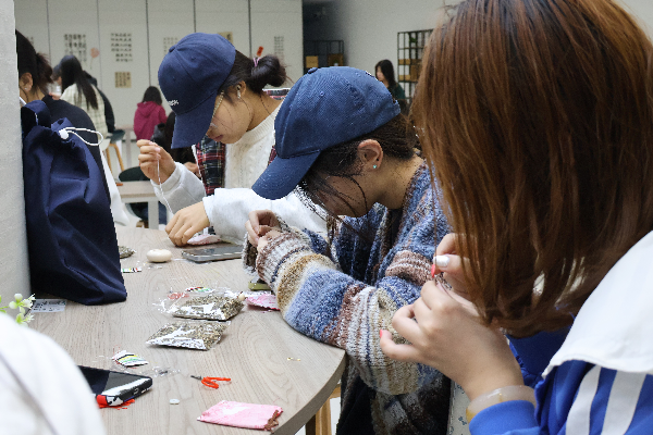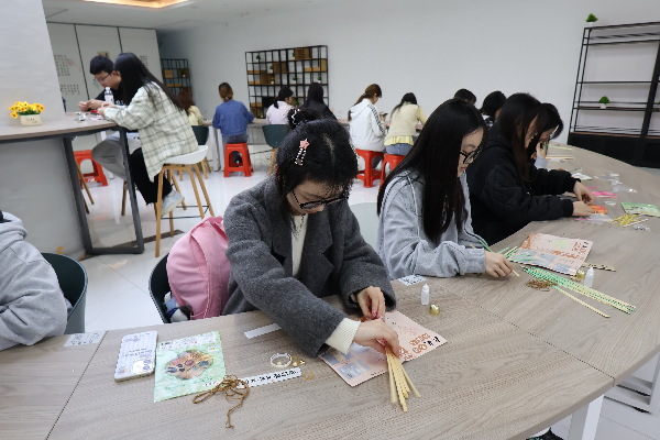 创作过程中,同学们或凝神专注、沉浸于非遗创作的乐趣,或轻声交流、分享灵感与制作心得。大家在动手实践中舒缓学业压力,在传统技艺里感受文化力量,每一件完成的作品,都凝聚着青春朝气与非遗匠心,绘就出青春与传统文化交融的生动图景。