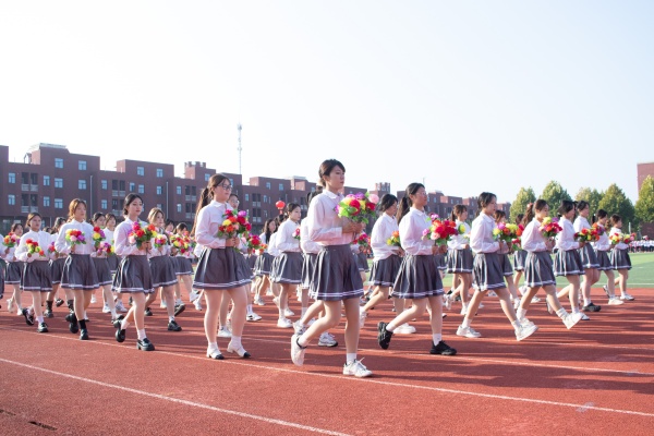 伴着激昂的旋律,国旗、校旗护卫队迈着铿锵的步伐入场。红旗方队、彩旗方队、鲜花方队、各运动员方队紧随其后。