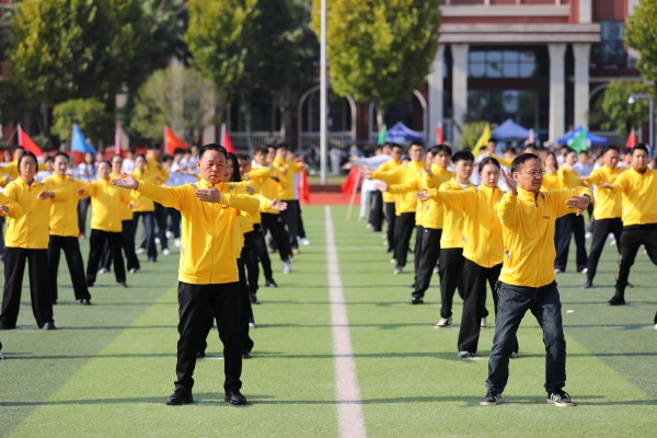 伴着舒缓悠扬的旋律,64名教职工和176名学生组成的方阵,带来的《舒活悦动“力”能聚》太极拳表演缓缓开场。他们起势沉稳、招式圆活,将太极的含蓄内敛和刚柔相济温演绎得淋漓尽致,尽显首义师生从容向上的精神风貌。由新法学院女生组成的方阵带来舞蹈《最美青春》,她们踩着轻快的节拍,灿烂的笑容和着灵动的舞姿,迸发出青春的美丽与魅力。